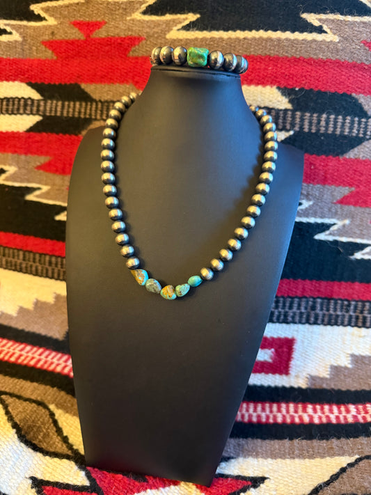 10mm Sterling Silver Navajo Pearl Necklace with Turquoise Nuggets 20" Long