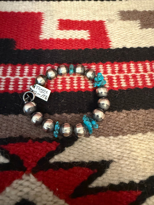 12mm Sterling Silver Navajo Pearl Toggle Bracelet with a Turquoise Nugget