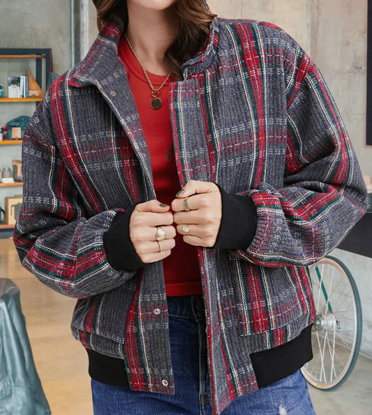 z Relaxed Fit Checkered Bomber Button Down Jacket