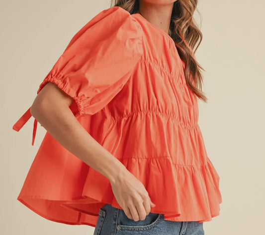 z Tiered Shirring Puff Sleeve Top Orange