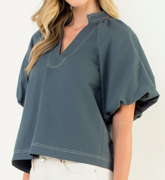 z Contrast Stitch Puff Sleeve V-Neck Top