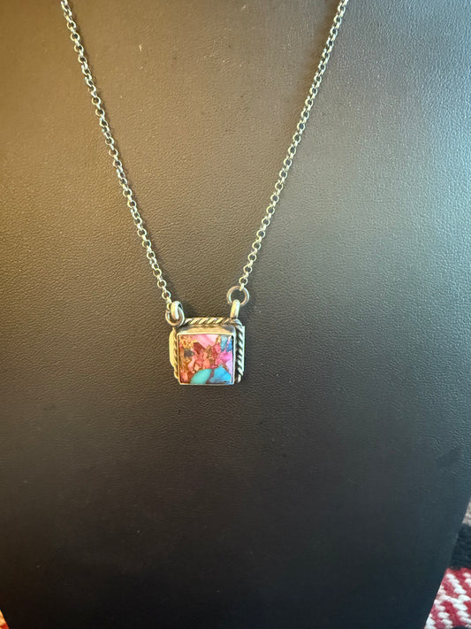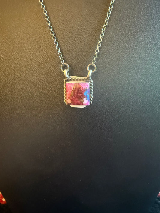 Sterling Silver Chain Necklace with a Square Pink Dahlia Stone Pendant 20" Long