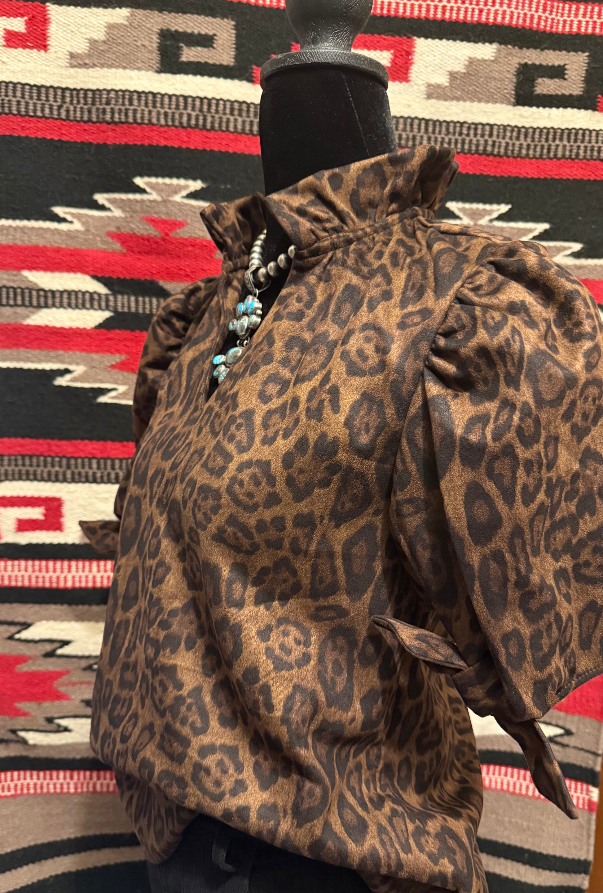 Beautiful leopard too that is super soft! Puffed sleeves that have a split and tie for added detail. V-Neckine with a stand up ruffled collar.