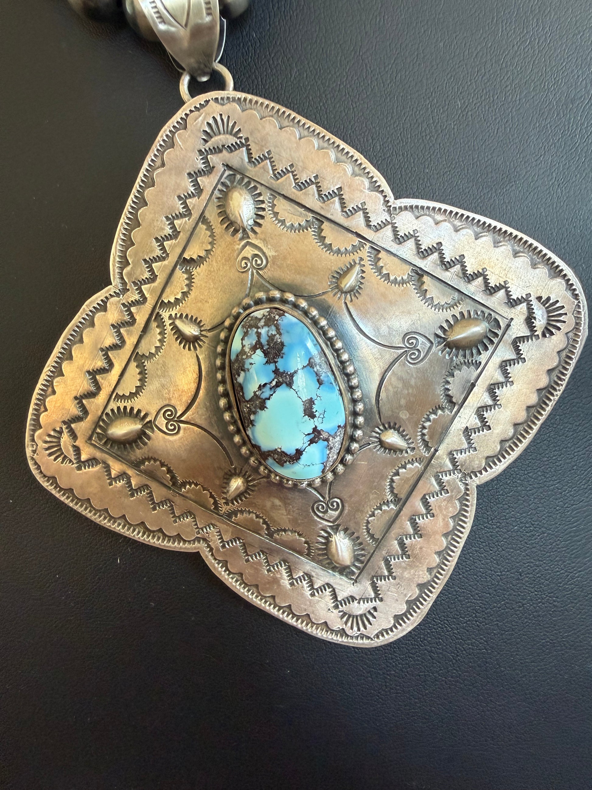 Sterling Silver Beautiful Designed Stamped Pendant with a Golden Hills Oval Stone in the Middle.