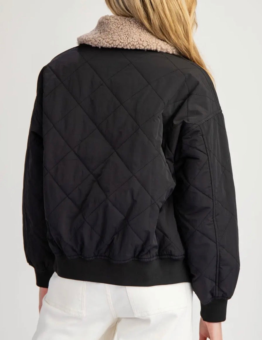 Quilted long sleeve jacket featuring a zipper front, a fur collar, two side hip pockets, ribbed cuffs, a ribbed bottom band, added seams for detail and is relaxed fit body.