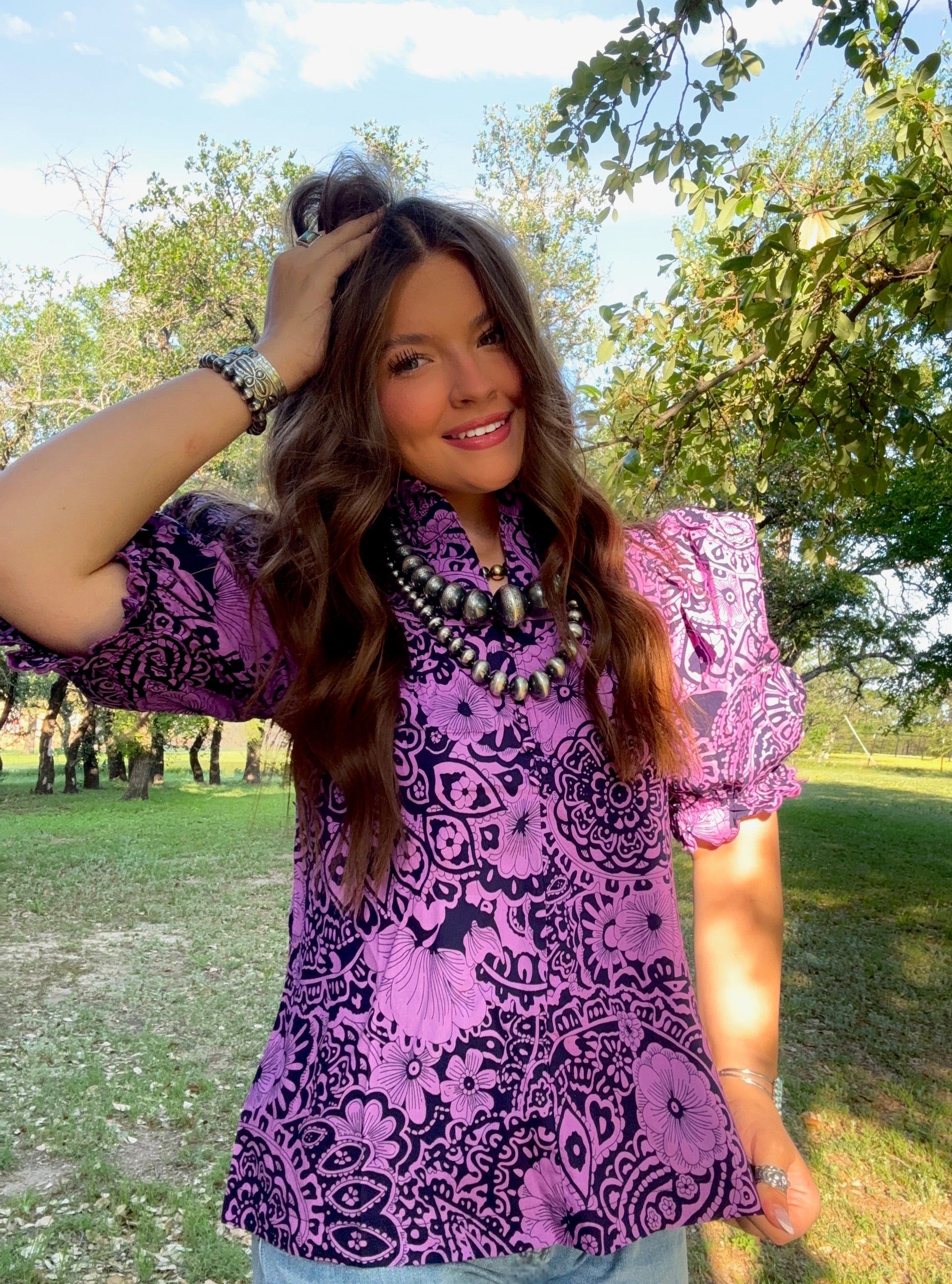 z Scalloped High Collar Half Sleeve Top with Buttons and Round Yoke