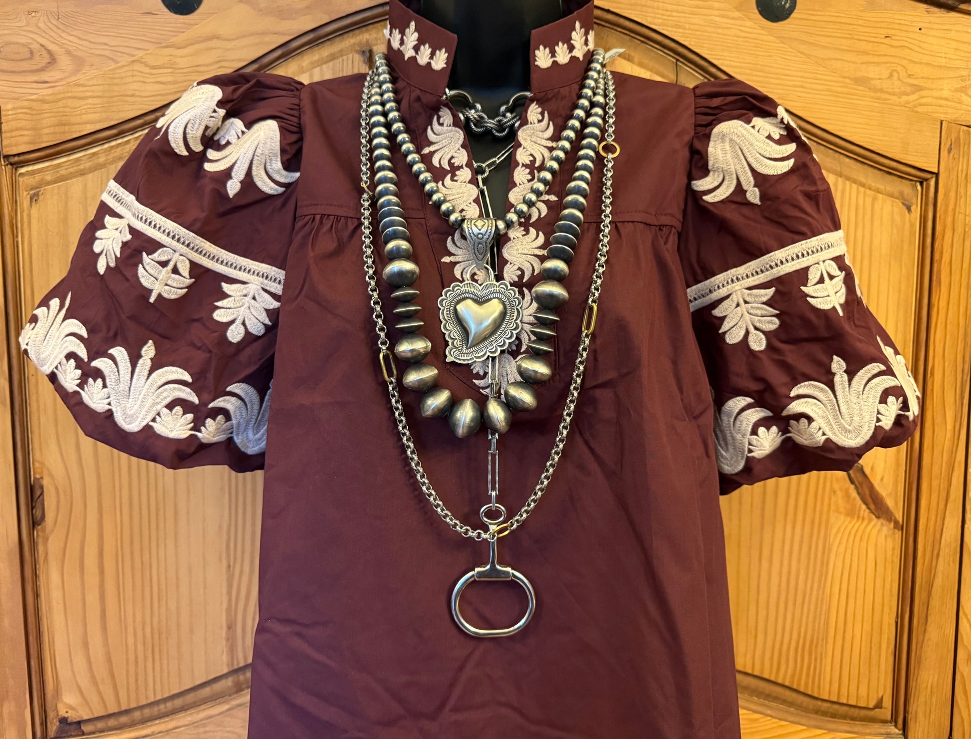 V-Neck band collar pullover top featuring embroidered placket and short bubble sleeves.